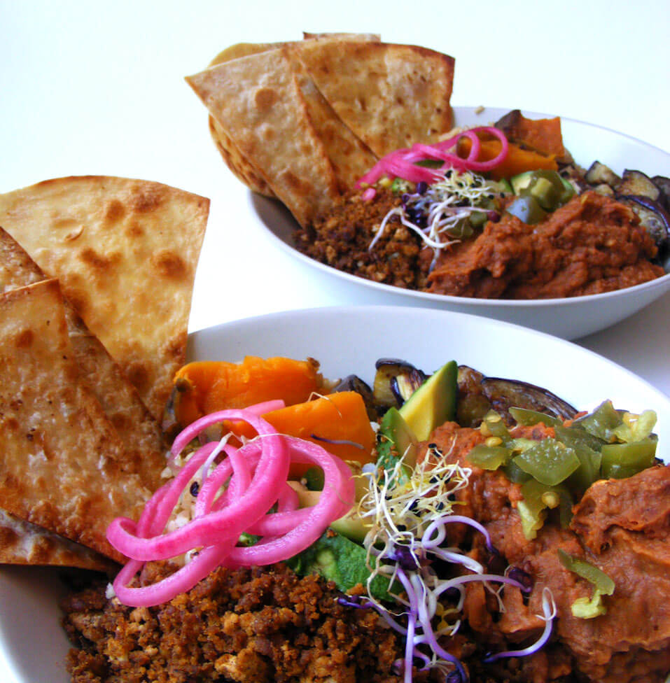 Een salade maak ik ook vaak van de burrito. Ik serveer warme, volle rijst met daarop tofu op Mexicaanse chorizowijze, gepekelde uiringen, blokjes avocado met frijoles refritos en nog veel meer en daarin verse taco’s geprikt.