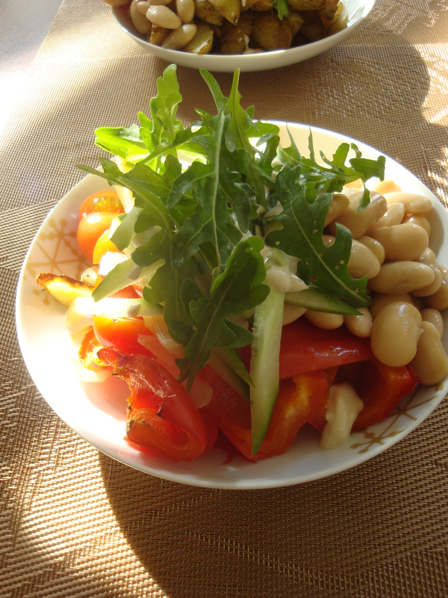 - Ovengegaarde, kruidige aardappelpartjes met boerentenen, geroosterde paprika, kerstomaat, komkommer en zelfgekweekte raketsla overgoten met tahindressing